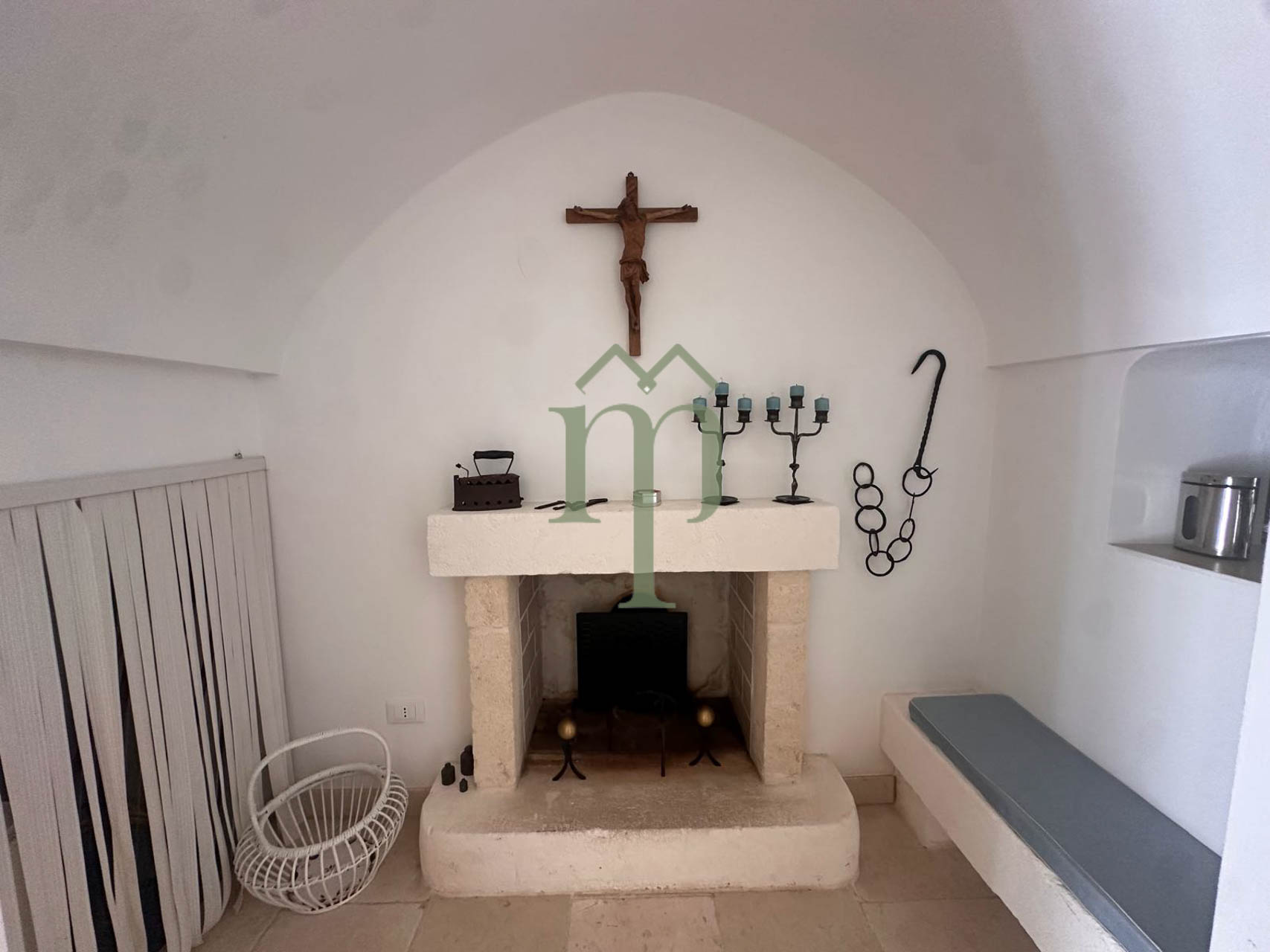 Sulla zona living si affaccia una bellissima alcova con camino e sedute intorno.