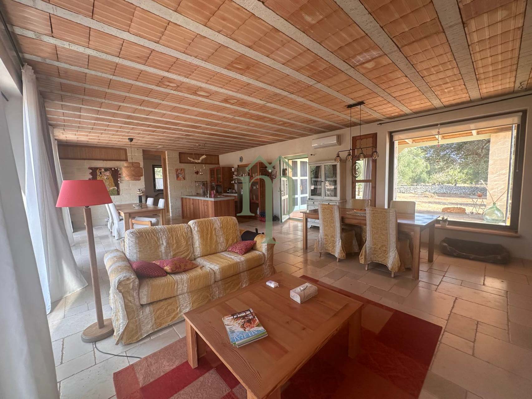 La casa conta circa 104 mq ed è composta da una grande zona centrale con una cucina open space ed una zona living attrezzata con divani e sedute a lato delle finestre. La zona è molto luminosa perchè sono presenti delle grandi vetrate di affaccio sulle verande e sul terreno, in questo modo si ha la vista sugli uliveti dalla zona living. Questa zona è servita da aria condizionata freddo/caldo.